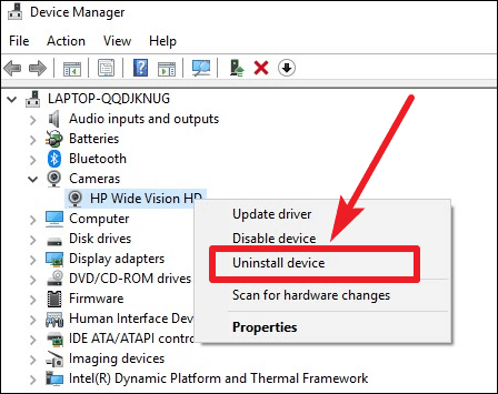 If updating the drivers didnât work, try this instead. Right-click on the start menu and select âDevice Managerâ from the available options. Then, go to your camera device and right-click on it. Select âUninstall deviceâ and click âOkâ.