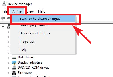 Then, go to âActionâ in the toolbar on Device Manager window and select âScan for Hardware Changesâ option.