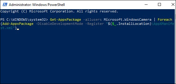 Get-AppxPackage -allusers Microsoft.WindowsCamera | Foreach {Add-AppxPackage -DisableDevelopmentMode -Register "$($_.InstallLocation)\AppXManifest.xml"}