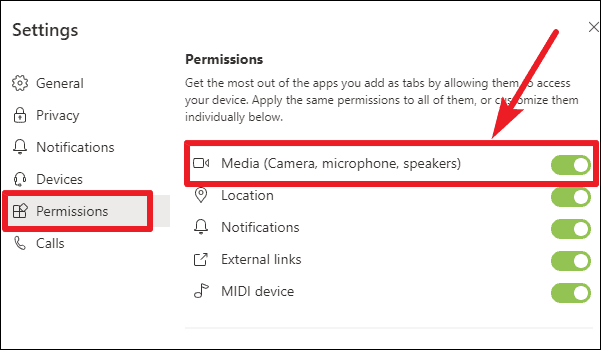 Teams settings will open. Go to âPermissionsâ on the left panel. Then, turn on the toggle for Media.