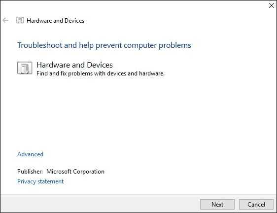 If the setting for âHardware & Devices Troubleshootâ is not available in the Settings app, then launch it by running the command below in Command Prompt.