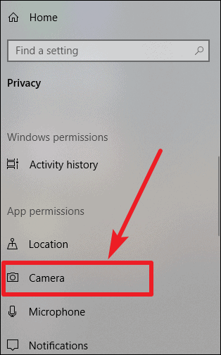 In the Privacy settings, scroll down in the left sidebar to go to âApp permissionsâ and click on âCameraâ to open camera settings.