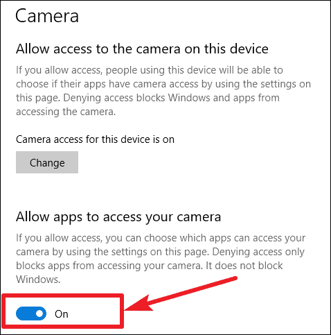 Make sure that the option âAllow apps to access your cameraâ is on. If it isnât, click on the toggle to turn it on.