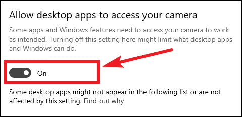 Also, scroll down and enable the toggle for âAllow desktop apps to access your cameraâ under the same settings.