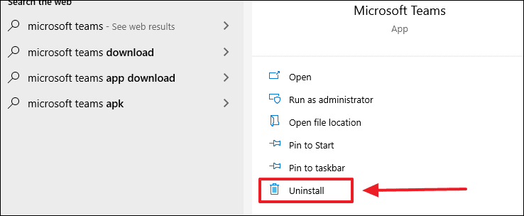 Open, the Start menu and search for ‘Microsoft Teams’. Then, select the ‘Uninstall’ link for Microsoft Teams app from the panel on the right in Start menu.