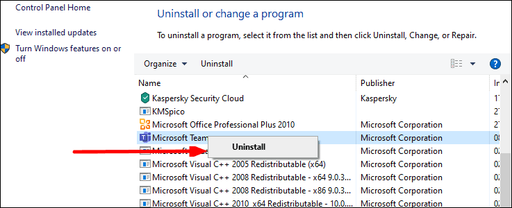 It will open the ‘Programs and Features’ window. Find Microsoft Teams in the list of all programs installed on your PC, right-click on it and select ‘Uninstall’.