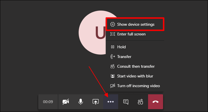 Place a call on Teams, it might be an audio call or a video call. Then, in the controls bar at the bottom of the call screen, click on the ‘More Actions’ (three dots) button and select ‘Show device settings’ from the available options in the menu that shows.