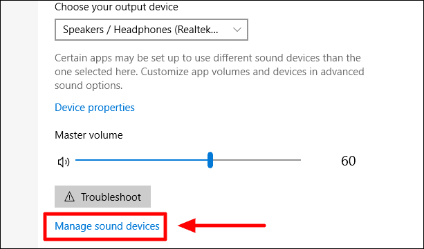 On the sound settings screen, click on the ‘Manage Sound Devices’ link to see a list of all sound devices on your computer.