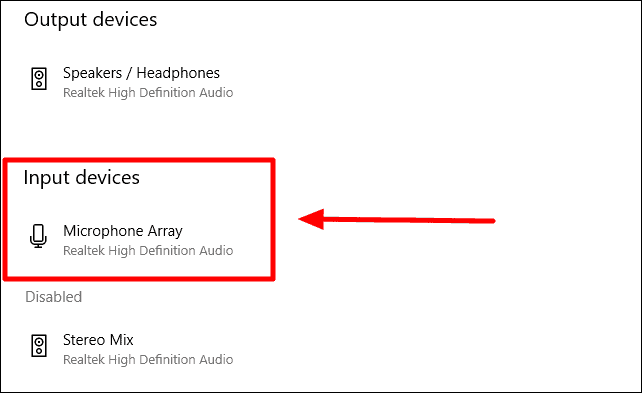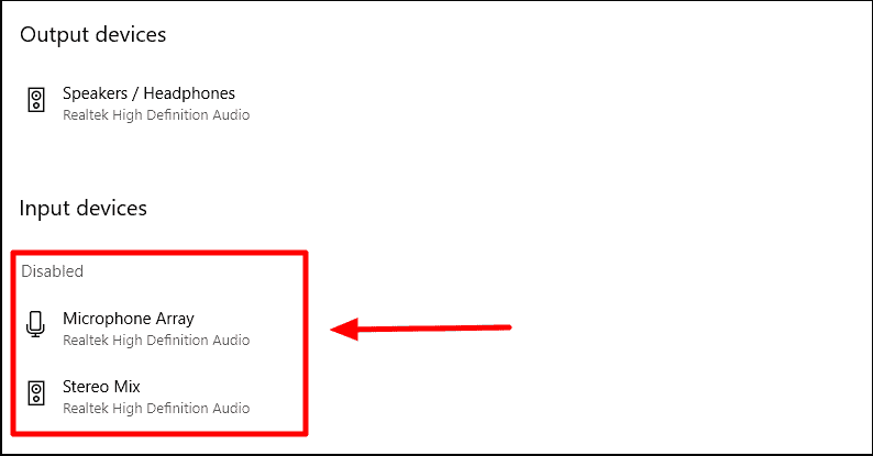In this list, you should see the Microphone device under ‘Input devices’ section. If it’s not there, then it’s probably disabled and listed under the ‘Disabled’ section on the screen.