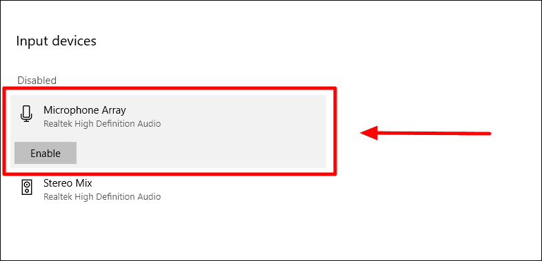 To enable your Microphone device, click on it and select the ‘Enable’ button from the expanded options to enable the device.
