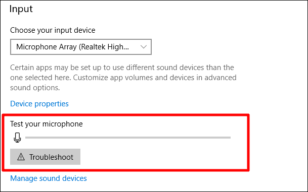 Test your microphone. Go back to the ‘Sound settings’ screen and under the ‘Input devices’ section you should see some variations in the meter below ‘Test your microphone’ label. If not, click the ‘Troubleshoot’ button to further fix any other issues.