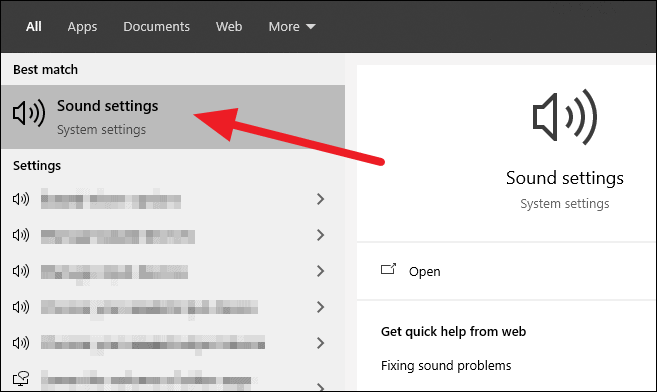 Open the Start menu and search for ‘Sound settings’, and then click to open the settings screen.