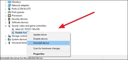 Find ‘Sound, video, and game controllers’ in the drivers’ list. Then, find your audio driver (Realtek Audio Driver is default driver on most systems). Right-click on it and uninstall it by clicking on the ‘Uninstall device’.