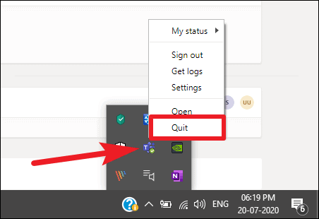 Now, the first thing you need to do is completely quit Microsoft Teams. Either go to the Microsoft Teams icon in the system tray and right-click on it to ‘Quit’ from the context menu. Or, you can choose to end the task from the Task Manager. Whatever floats your boat.