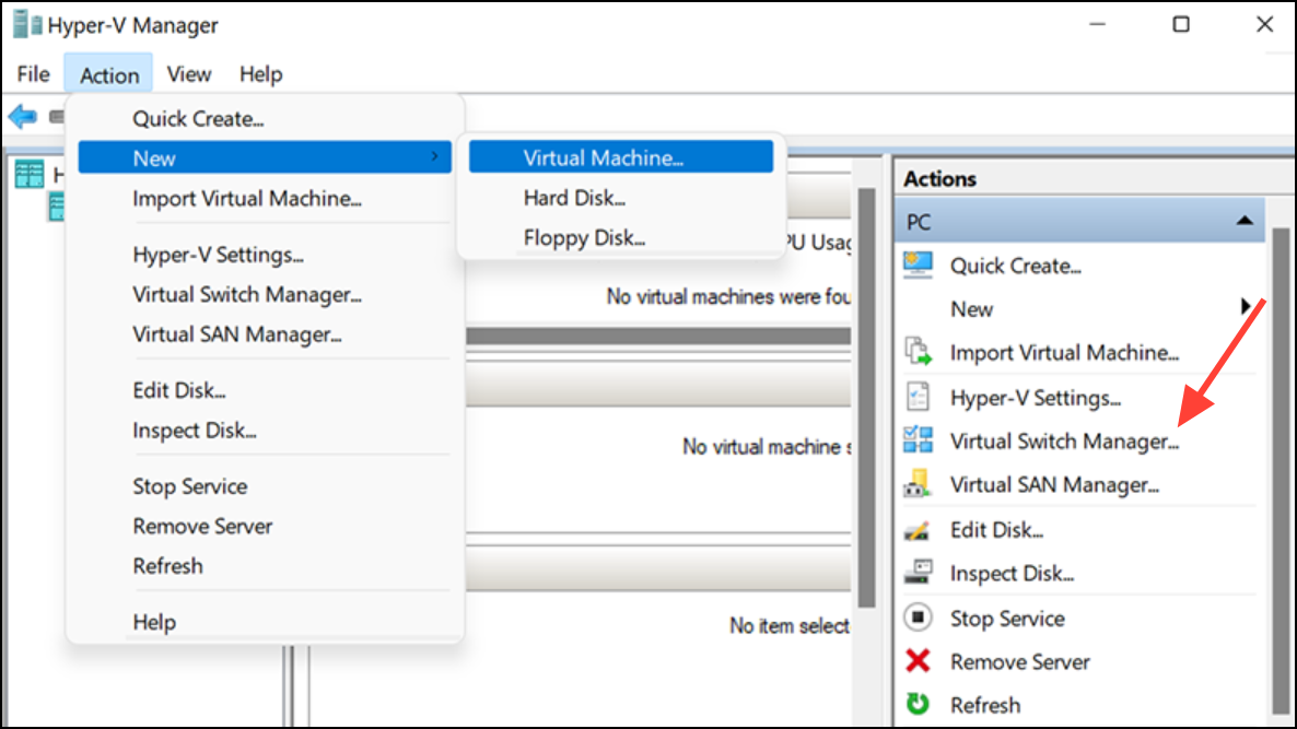 Step 1: Open Hyper-V Manager on your Windows 11 system and select the host machine from the left panel. Click on "Virtual Switch Manager" in the Actions pane. This tool lets you create and manage network switches for your virtual machines.