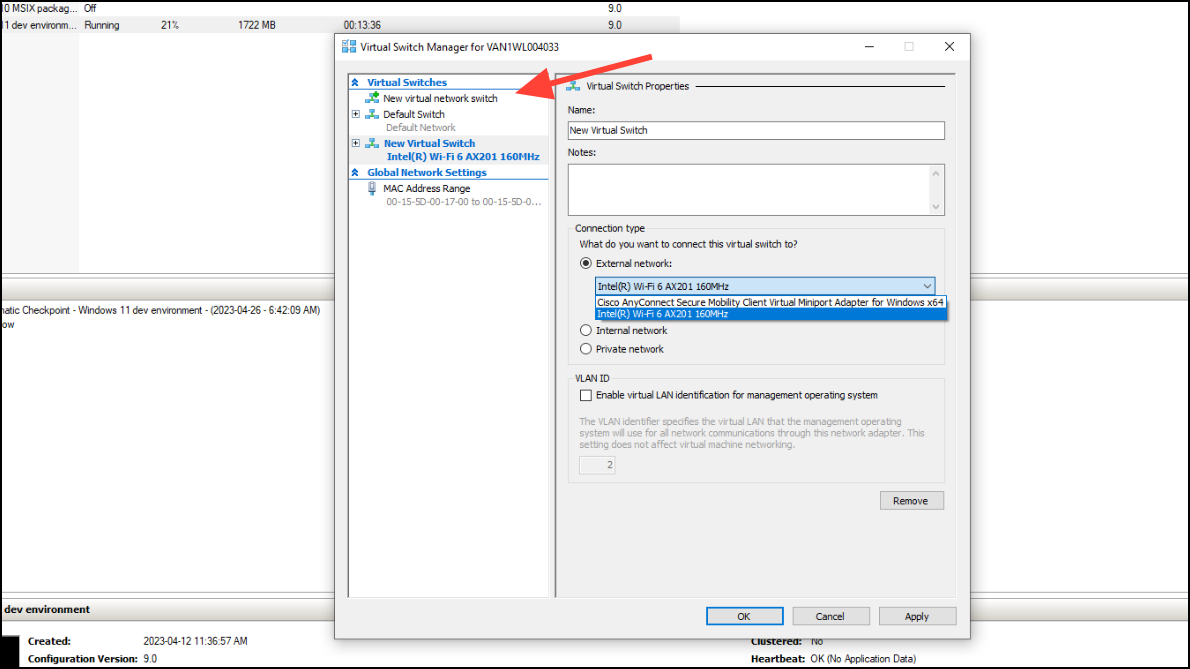 Step 2: Choose "New virtual network switch," then select "External" if you want your Ubuntu Server VM to access your physical network and the internet. Click "Create Virtual Switch." Assign a name and select the physical network adapter your computer uses for internet access. Save the changes.