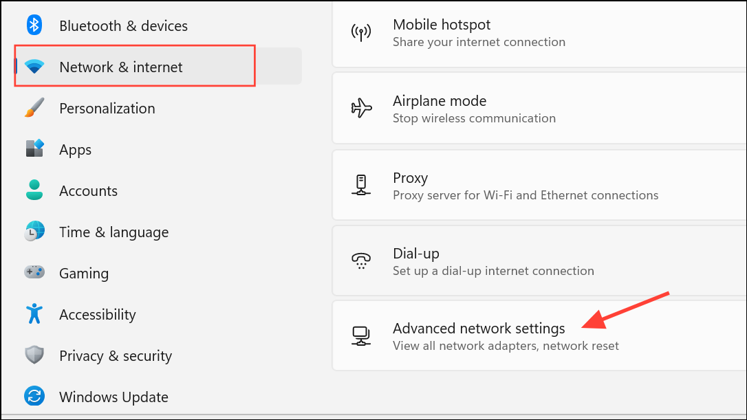 Step 1: Open Settings with Windows + I. Navigate to Network & Internet and select Advanced network settings.
