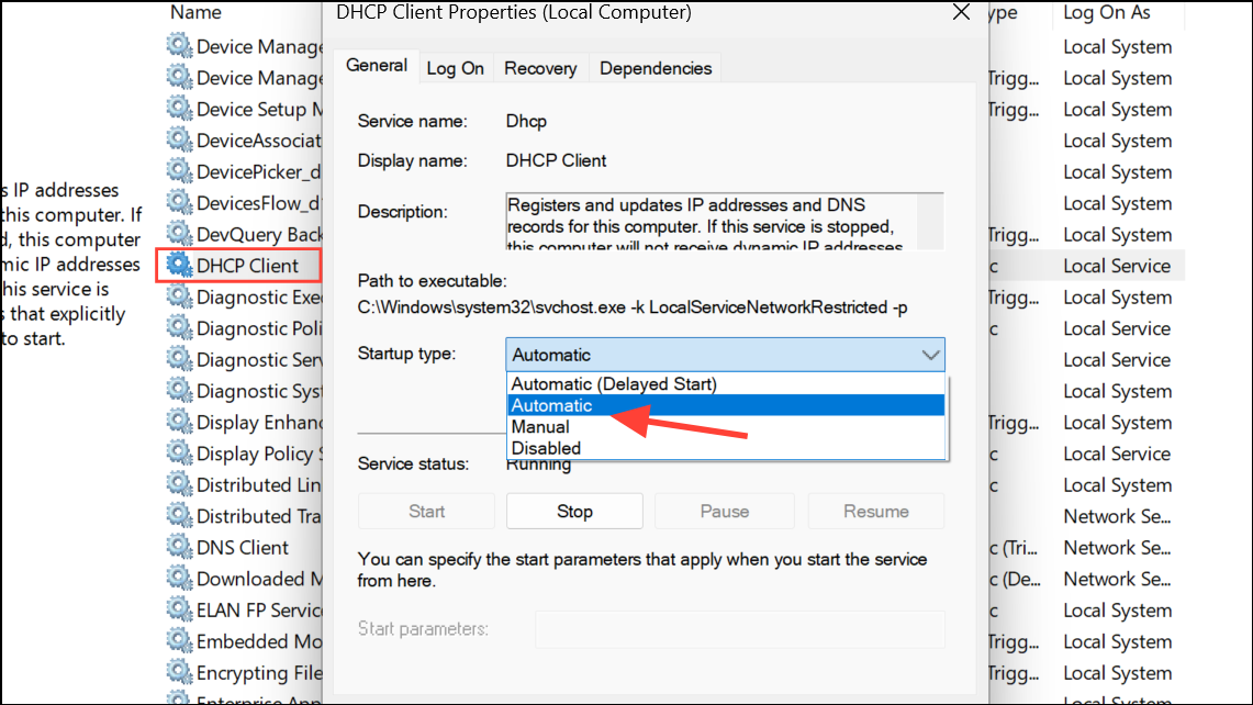 Step 3: Repeat for other critical services such as DHCP Client, Network Connections, and Network List Service.