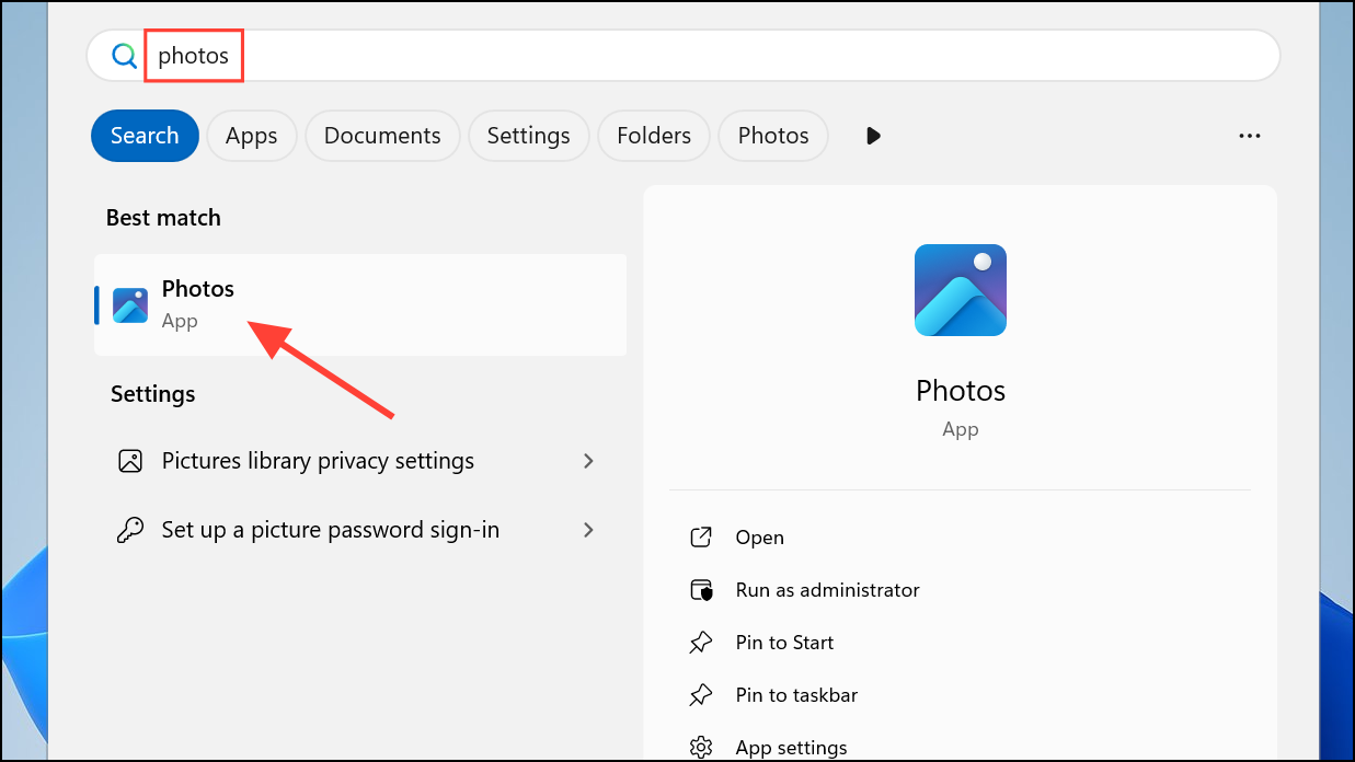 Step 1: Open the current Photos app by searching for Photos in the Start menu and selecting it from the results.