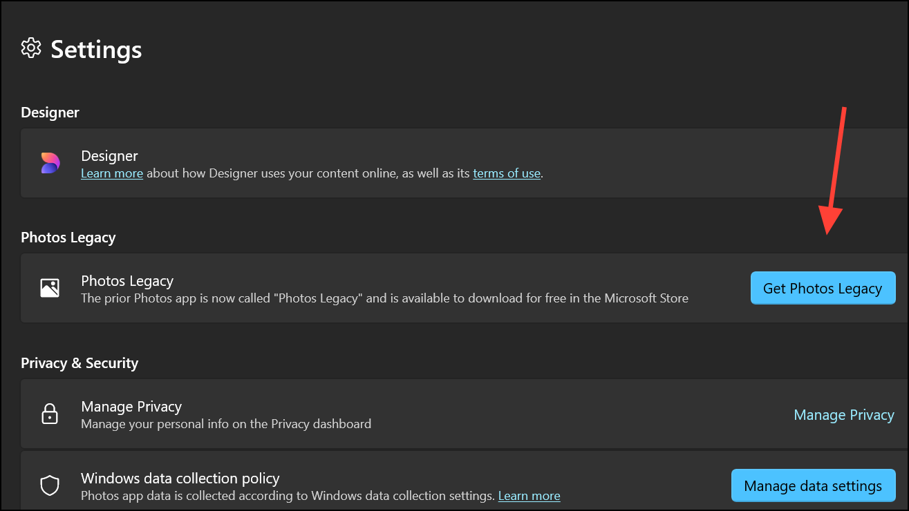 Step 3: Scroll down to the section labeled "Get Photos Legacy" and click the link to download Microsoft Photos Legacy from the Microsoft Store. This older version of the app is less affected by recent update conflicts and is designed to provide consistent image viewing functionality.