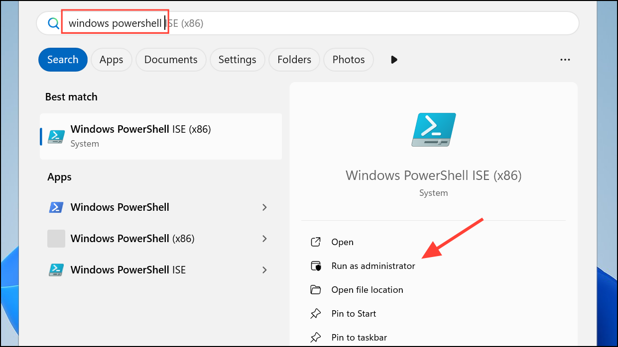 Step 1: Press the Windows key, type Windows PowerShell, right-click the result, and select Run as administrator.