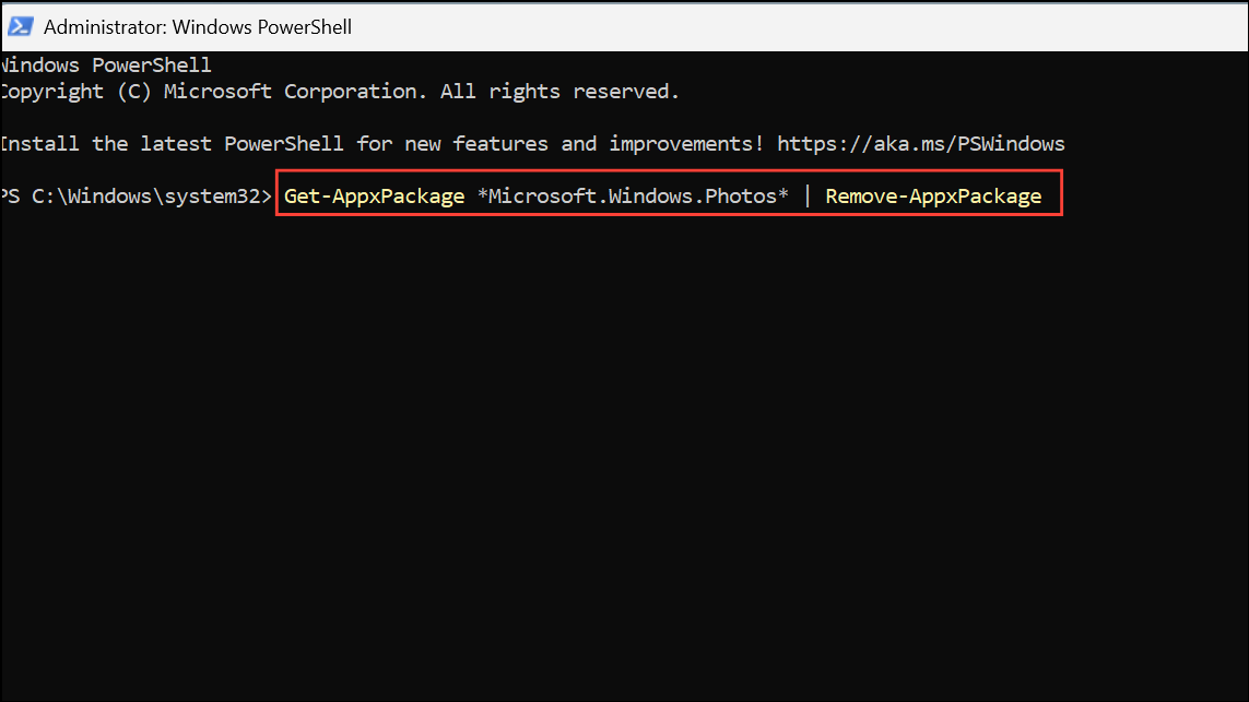 Get-AppxPackage *Microsoft.Windows.Photos* | Remove-AppxPackage