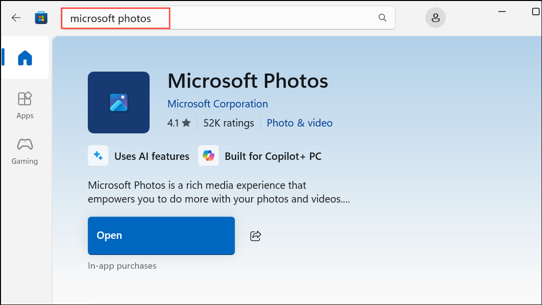 Step 3: After the process completes, open the Microsoft Store, search for Microsoft Photos, and install the app again.
