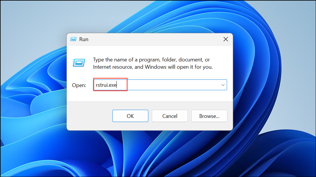 Step 1: Press Windows + R to open the Run dialog, type rstrui, and press Enter to launch System Restore.