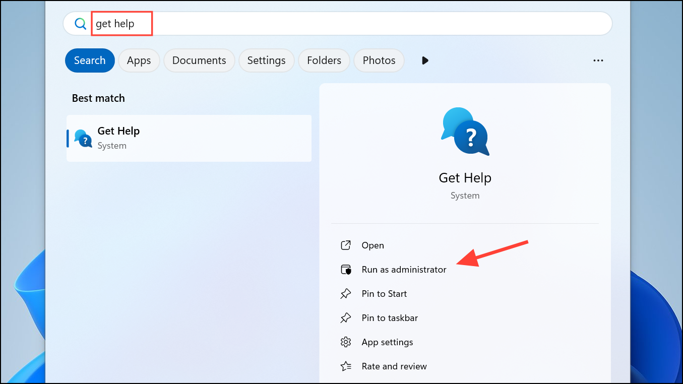 Step 1: Launch the Get Help app on your Windows 11 PC. To do this, type Get Help into the Windows search bar and click on Run as administrator. This tool is pre-installed on Windows 11 and does not require a separate download.