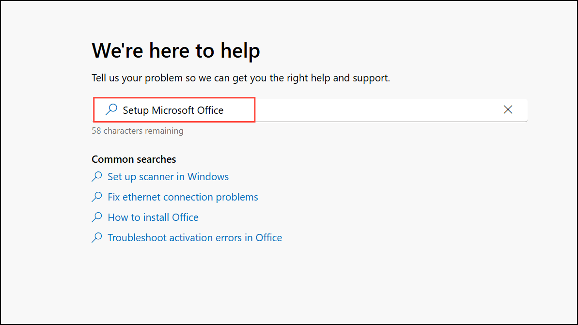 Step 2: In the Get Help app’s search bar, enter Setup Microsoft Office. This search will surface the Microsoft 365 Setup Troubleshooter, specifically designed for Office installation problems.