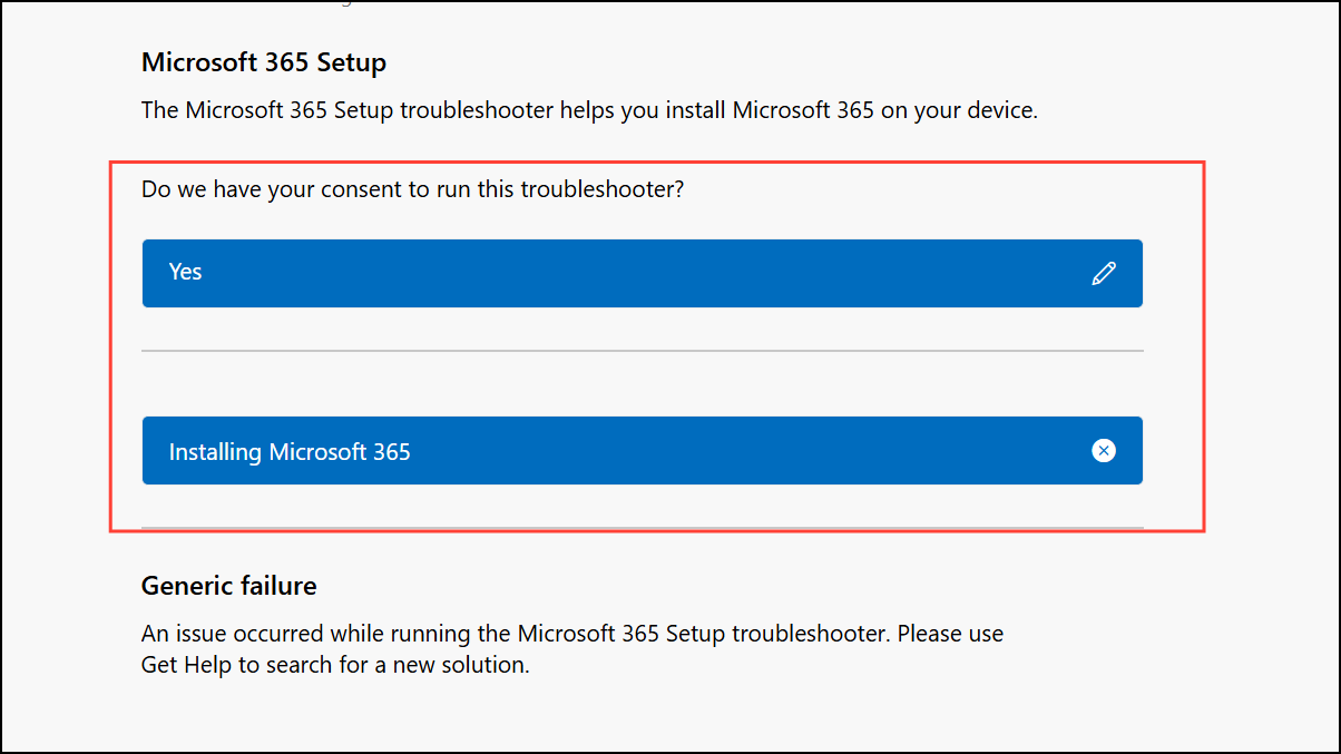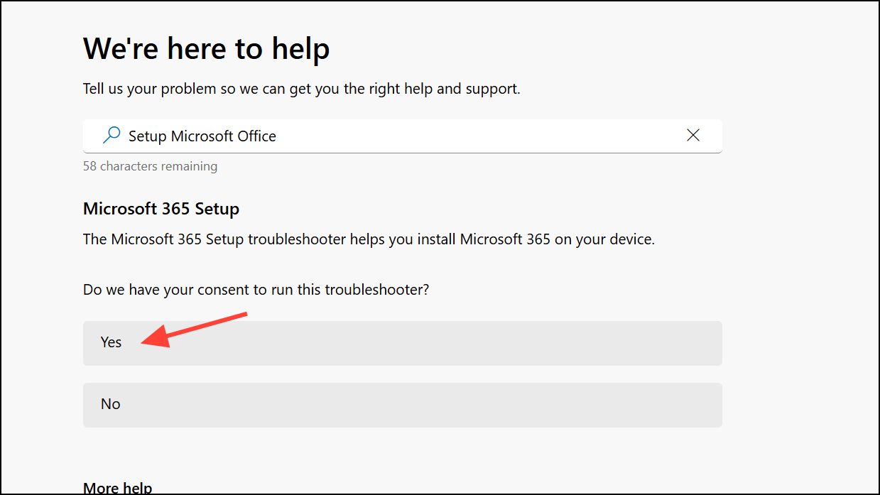 Step 3: Click the Yes button for the Microsoft 365 Setup Troubleshooter. If prompted, sign in with your Microsoft account credentials. This ensures the troubleshooter can check your license status and subscription details, which are often linked to installation issues.