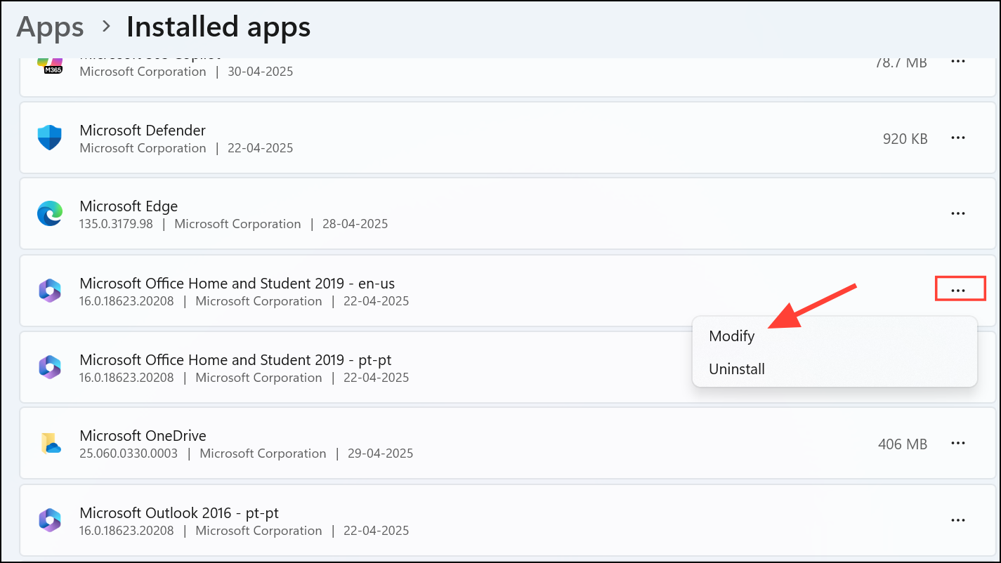 Step 2: Find Microsoft Office in the list, click the three-dot menu, then select Modify.