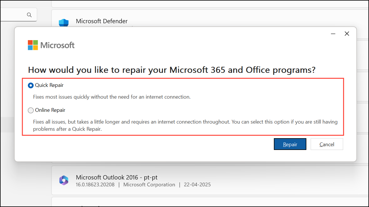Step 3: Choose Online Repair for a thorough fix, or Quick Repair for a faster, less comprehensive option. Follow prompts to complete the repair and restart your PC.