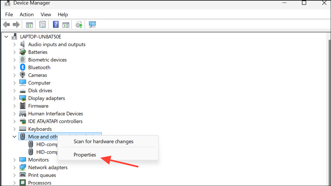 Step 2: Expand the Keyboards and Mice and other pointing devices sections. For each entry (for example, HID Keyboard Device or HID-compliant mouse), right-click and select Properties.