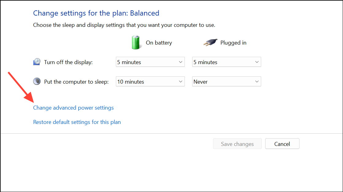 Step 2: Click Change plan settings next to your active power plan, then select Change advanced power settings.