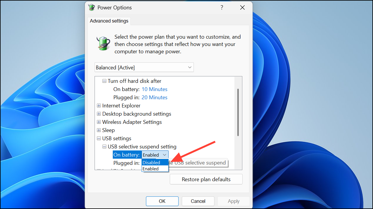 Step 3: In the Advanced settings dialog, expand USB settings > USB selective suspend setting. Set it to Disabled for both On battery and Plugged in (if available).