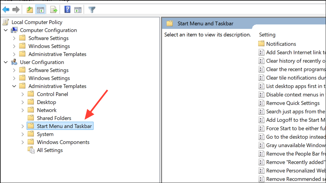 Step 2: In the Group Policy Editor, navigate to User Configuration > Administrative Templates > Start Menu and Taskbar.