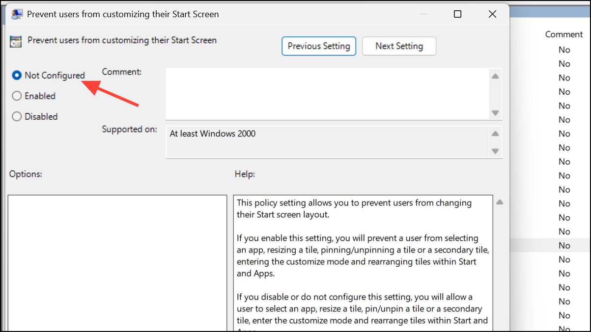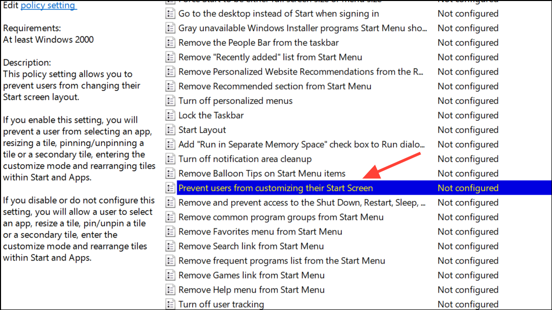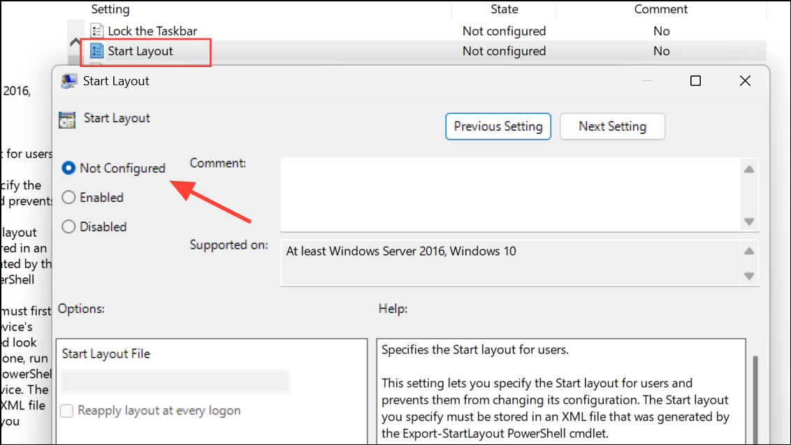 Step 5: Find the Start Layout policy in the same section. Double-click and set it to Disabled or Not Configured. Apply the changes and close the editor.