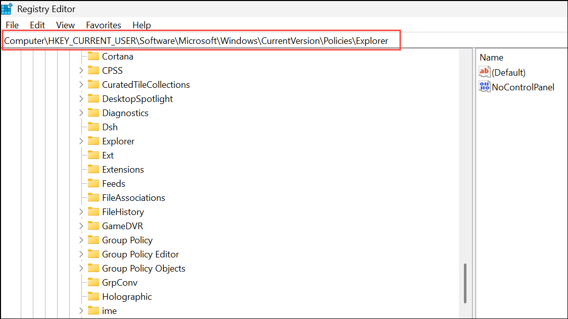 Step 2: Navigate to HKEY_CURRENT_USER\SOFTWARE\Microsoft\Windows\CurrentVersion\Policies\Explorer.