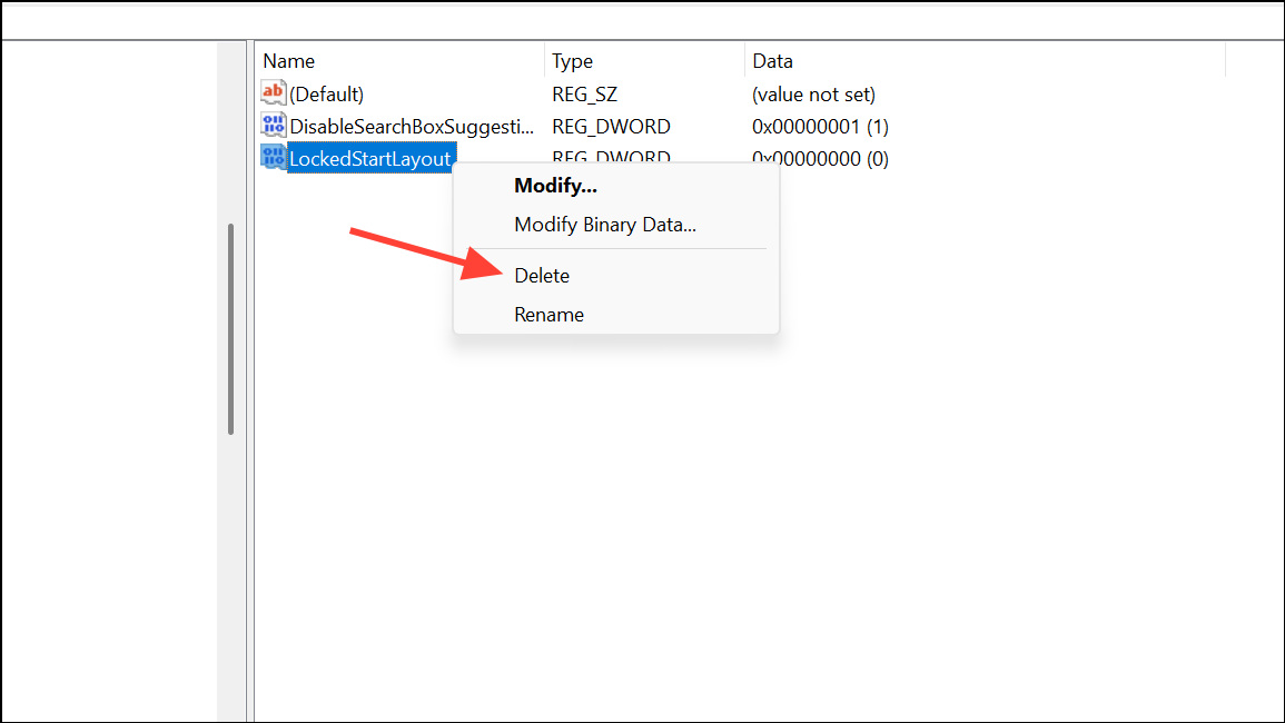 Step 3: If you see a value named NoChangeStartMenu, right-click and delete it. Confirm the deletion.
