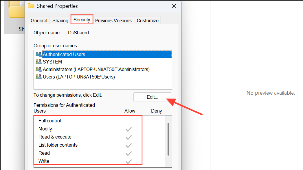 Step 2: Ensure your user account or the account running Robocopy has at least "Modify" or "Full Control" permissions. If necessary, click "Edit" to adjust permissions and apply changes.