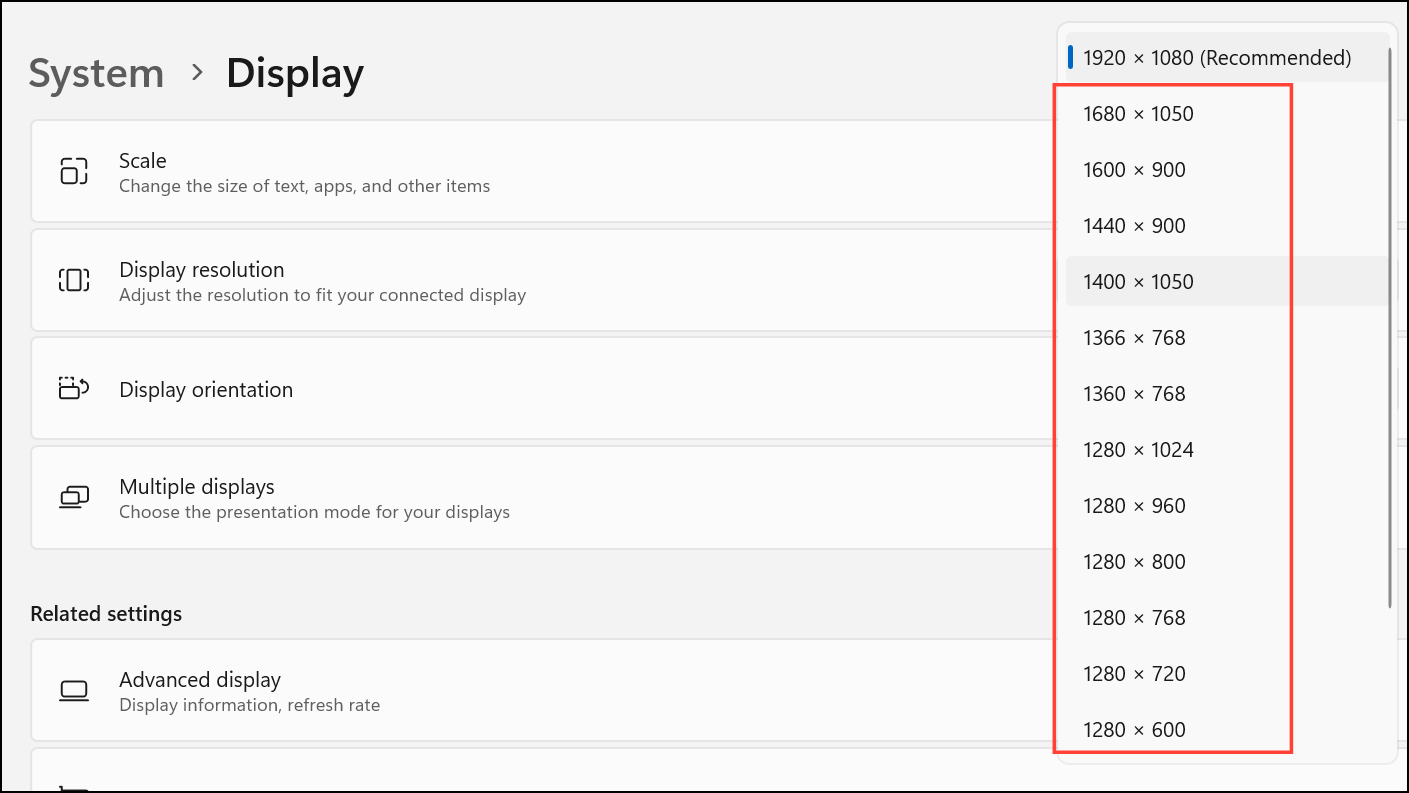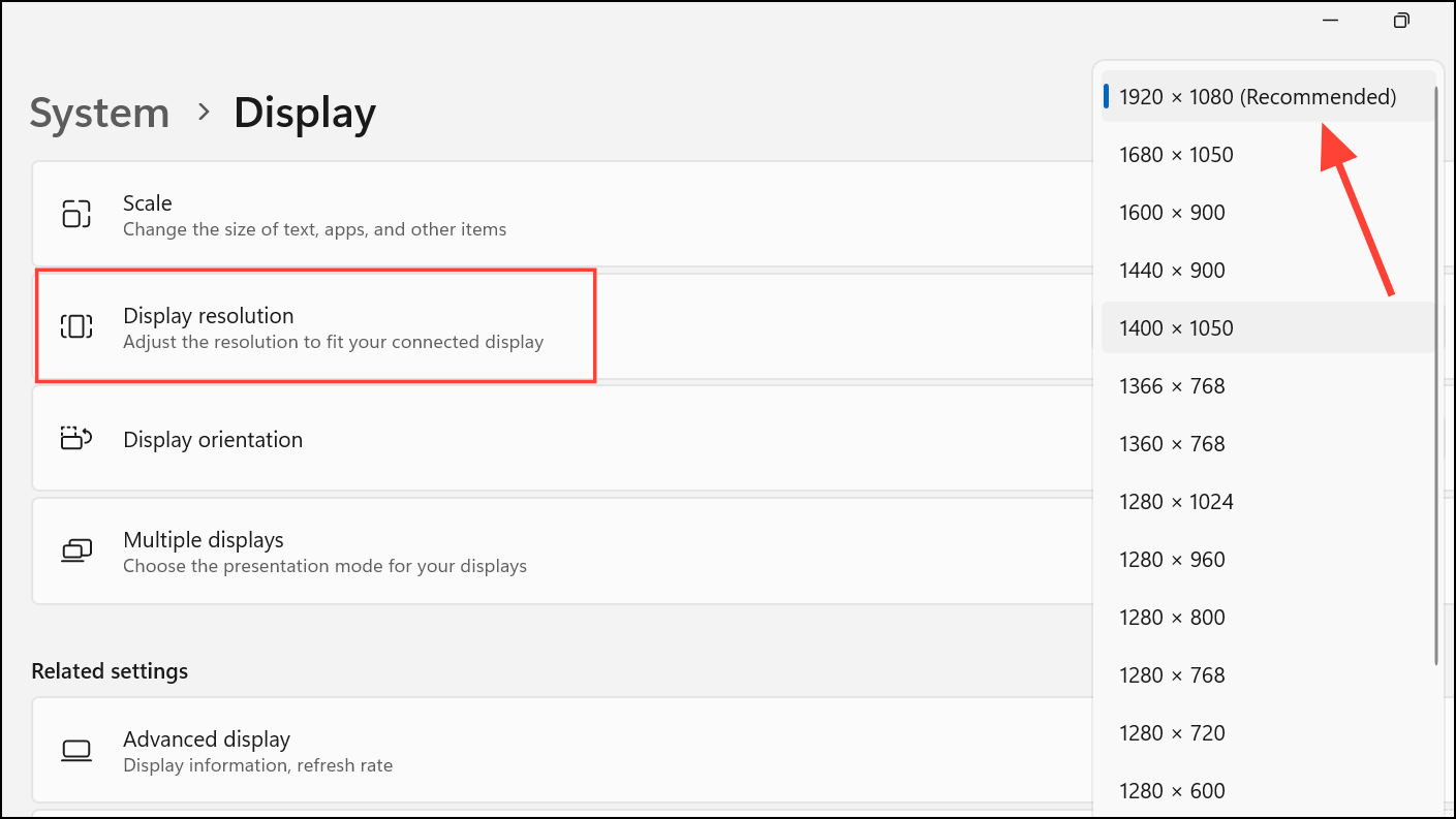 Step 2: In the Display settings window, locate the Display resolution section. Use the dropdown menu to select the resolution marked as (Recommended). This value matches your monitor’s native resolution and typically restores the correct aspect ratio, eliminating stretching or black bars.