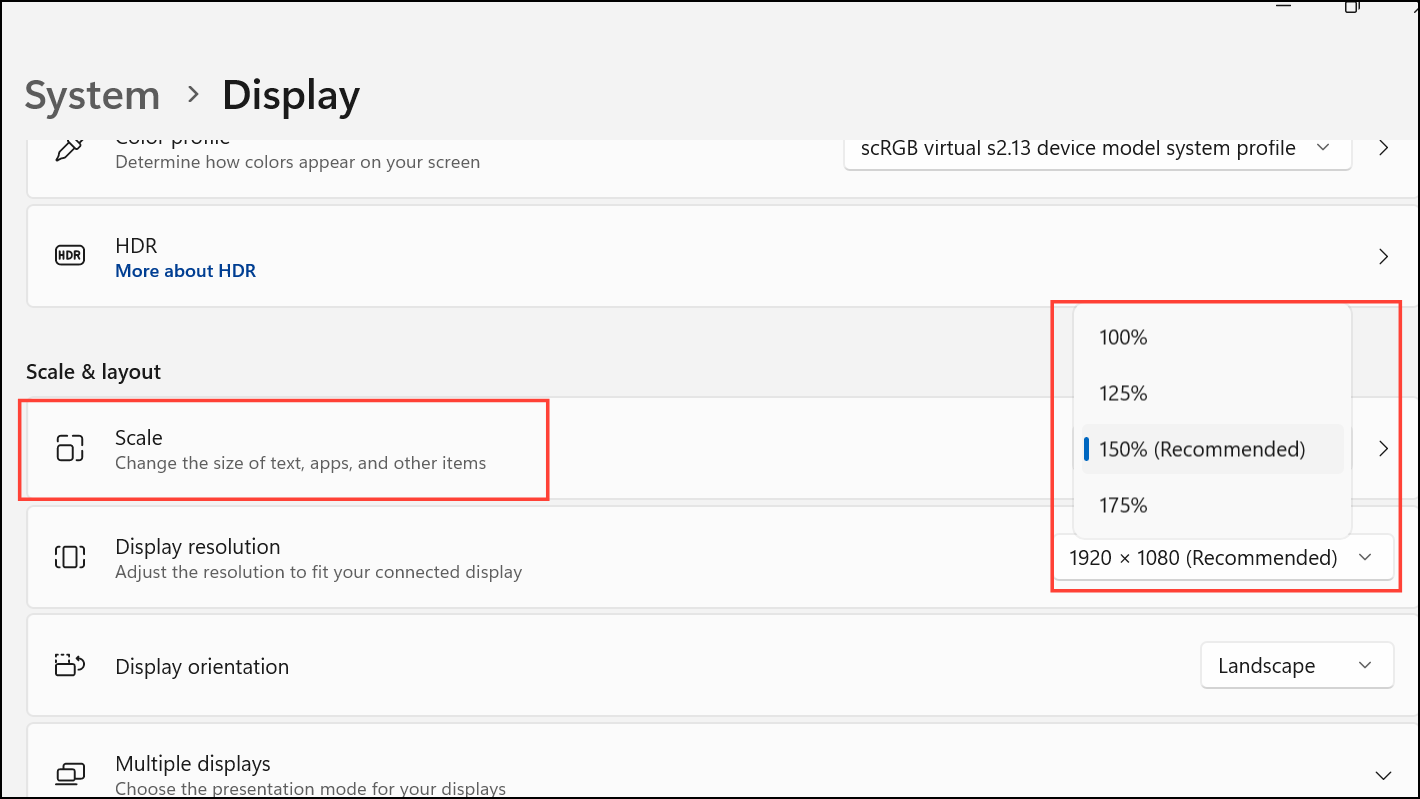 Step 4: Adjust scaling if text or apps appear too large or too small. In the Scale & layout section, use the Scale dropdown to select a suitable percentage (commonly 100%, 125%, or 150%). Custom values can be entered for more precise control, but extreme settings may cause display issues or require signing out and back in.
