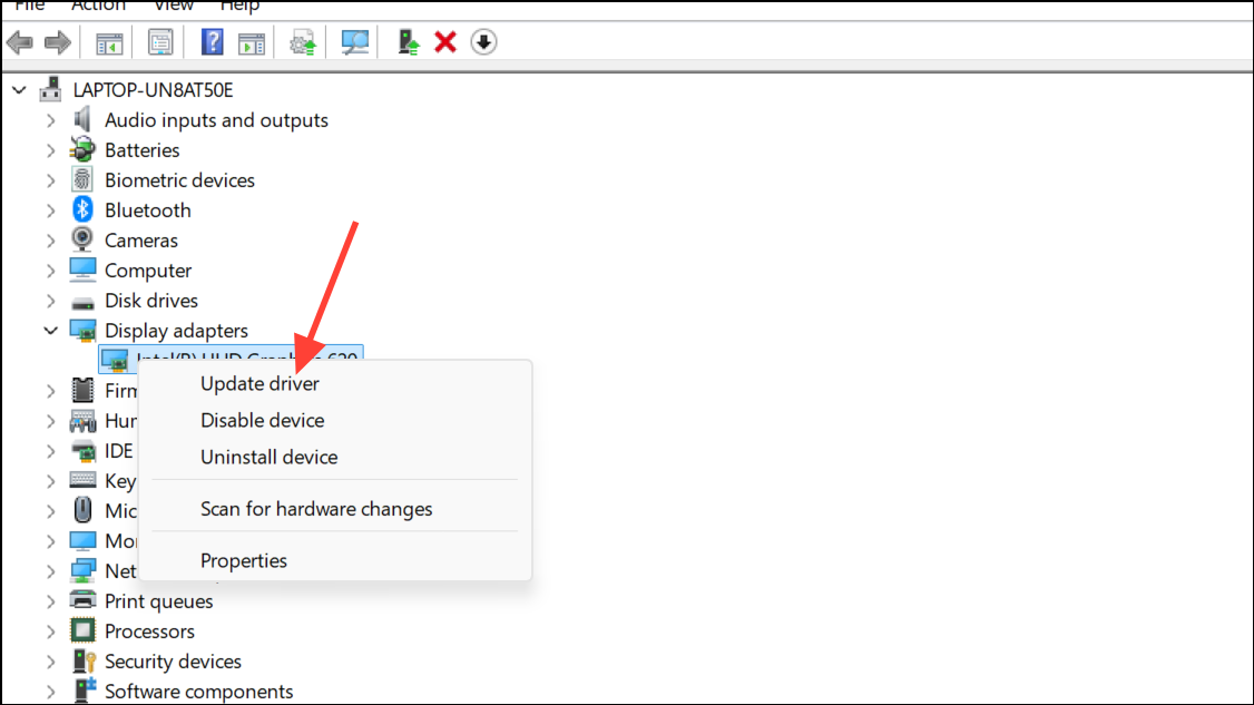 Step 2: Expand the Display adapters section, right-click your graphics device, and choose Update driver. Select Search automatically for drivers to let Windows locate and install the latest version.