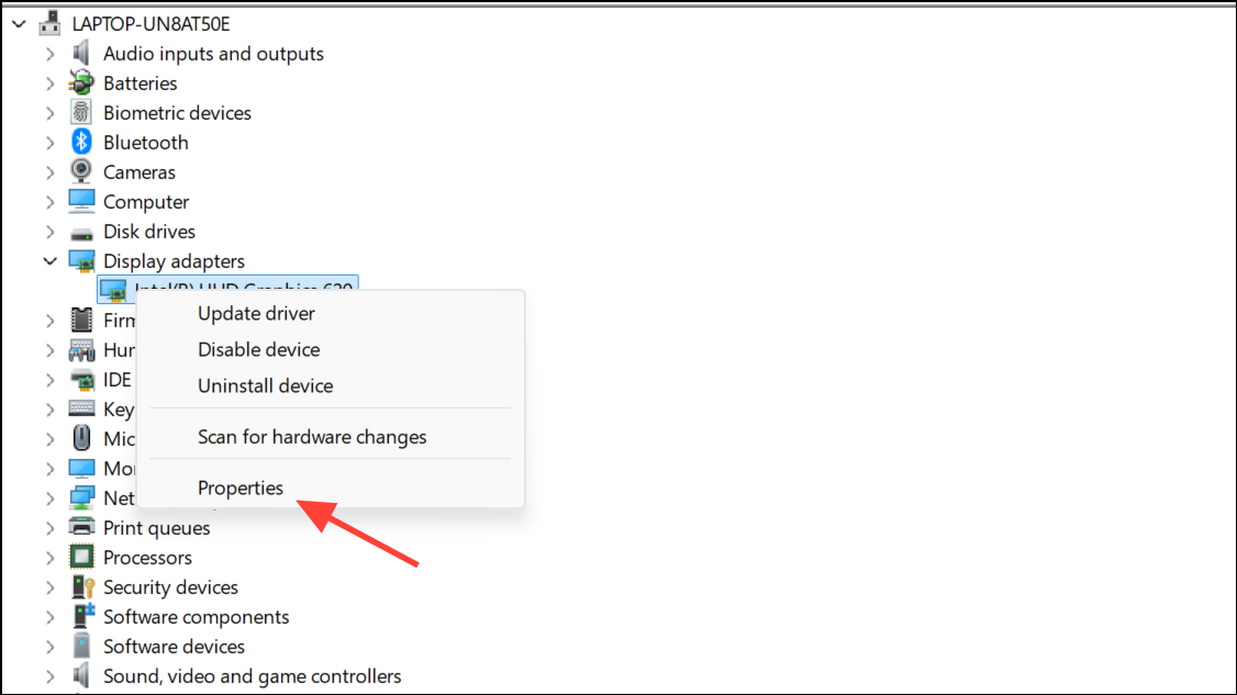 Step 3: If screen issues appeared after a recent update, return to Device Manager, right-click your graphics adapter, and choose Properties.