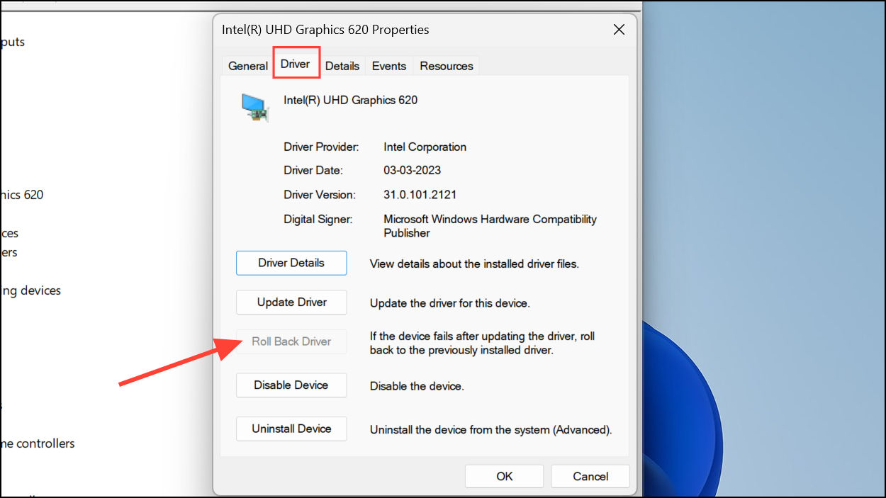 Step 4: Under the Driver tab, click Roll Back Driver if available. This restores the previous driver version, which may resolve compatibility or display problems.