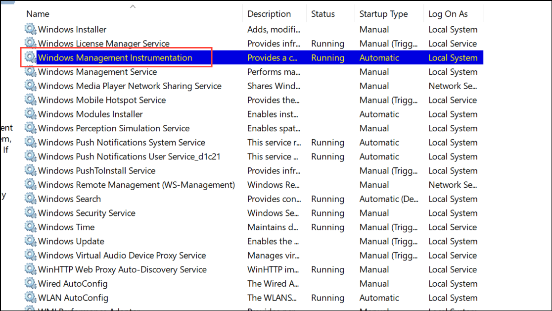 Step 1: Press Windows + R to open the Run dialog. Type services.msc and press Enter. If the console opens, locate critical services such as Windows Management Instrumentation (WMI) and Windows Modules Installer.