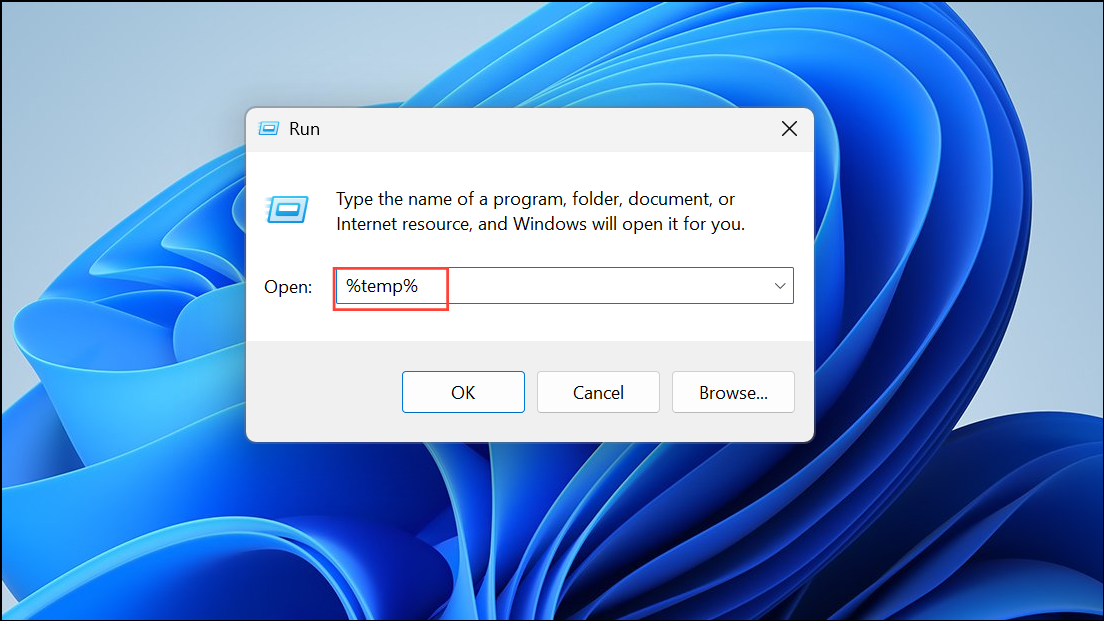 Step 1: Press Windows + R, type %temp%, and press Enter. Delete all files in the folder to remove temporary files that may interfere with system processes.