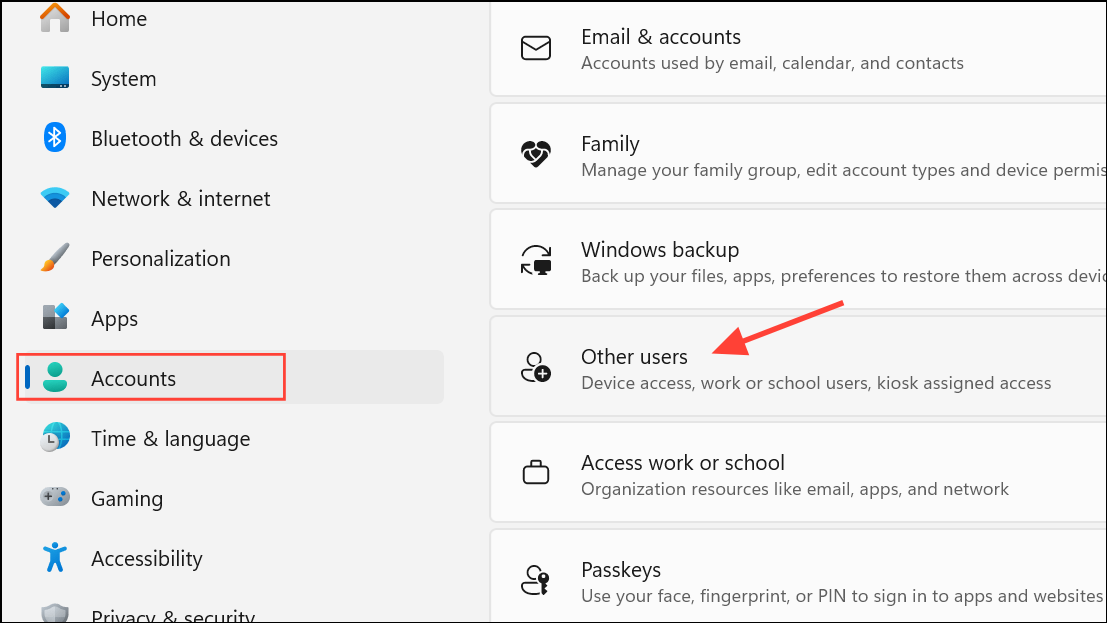 Step 1: Open Settings with Windows + I. Go to Accounts > Family & other users.