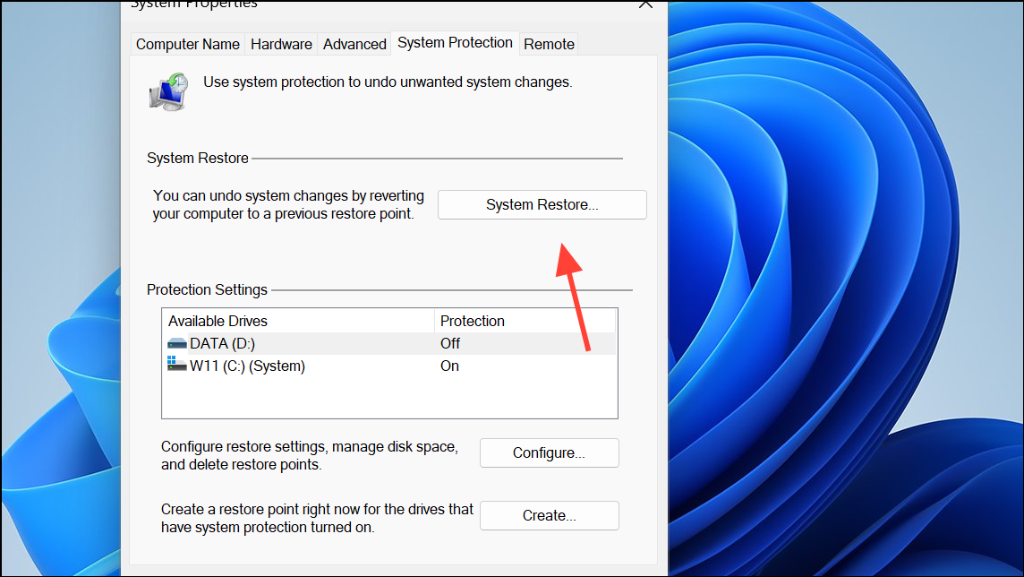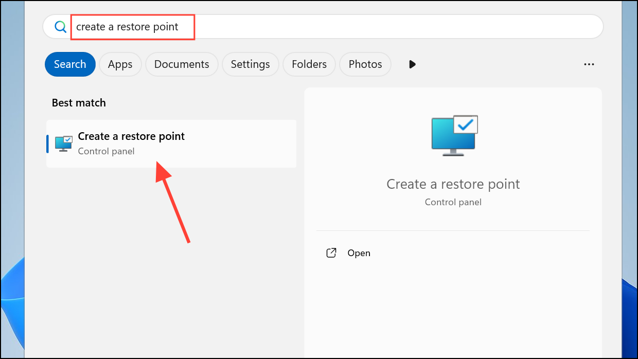 Step 1: Type Create a restore point in the Windows Search bar and open the matching result.